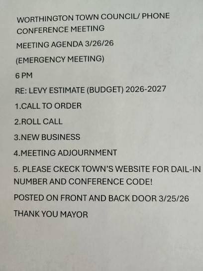 Please be advised that, effective April 2026, meetings of the Worthington Town Council will no longer be held at Worthington Town Hall.