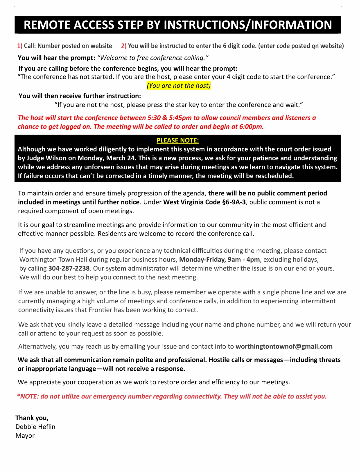 Council has been assured that holding meetings in this manner is fully legal and in compliance with the guidelines of the West Virginia state code.
